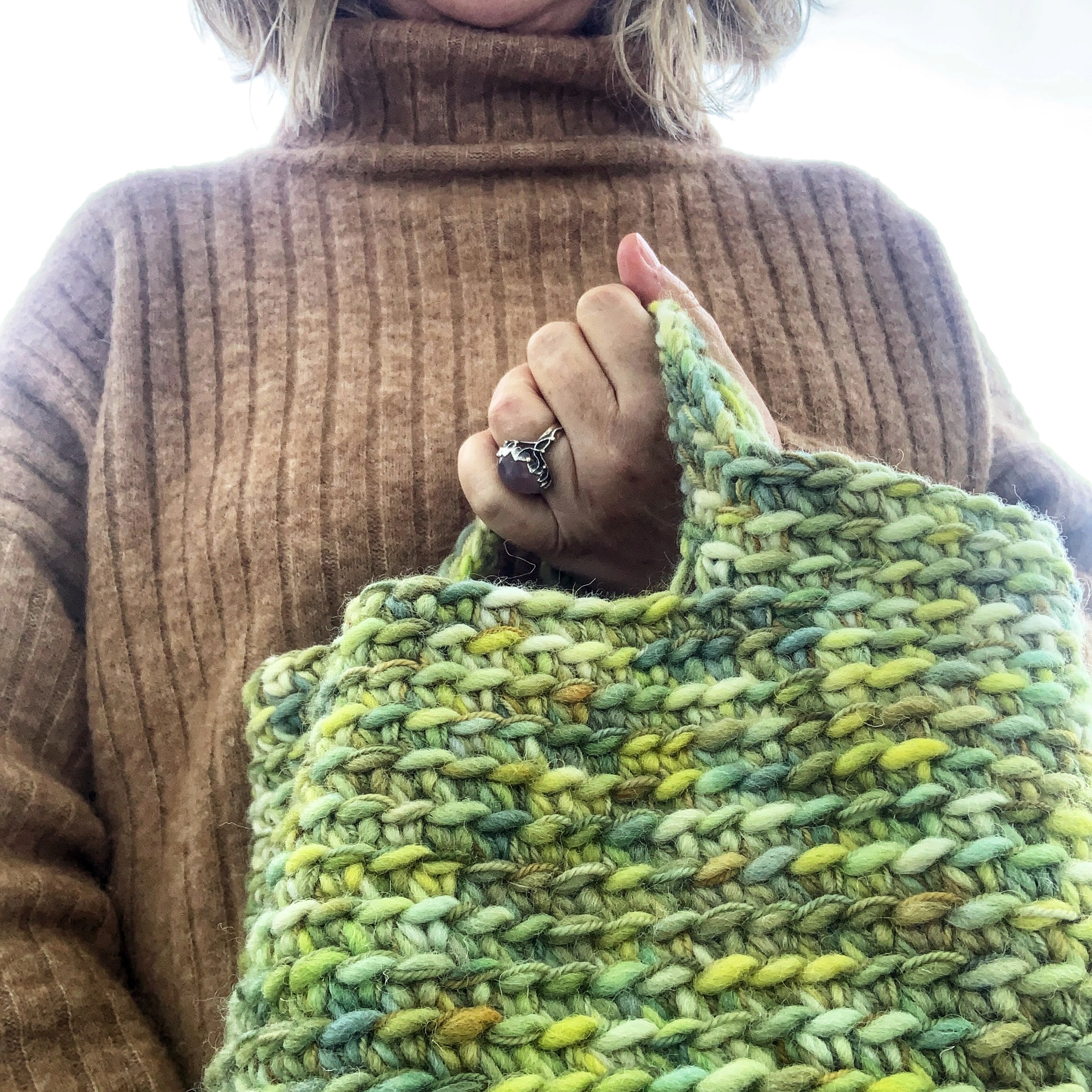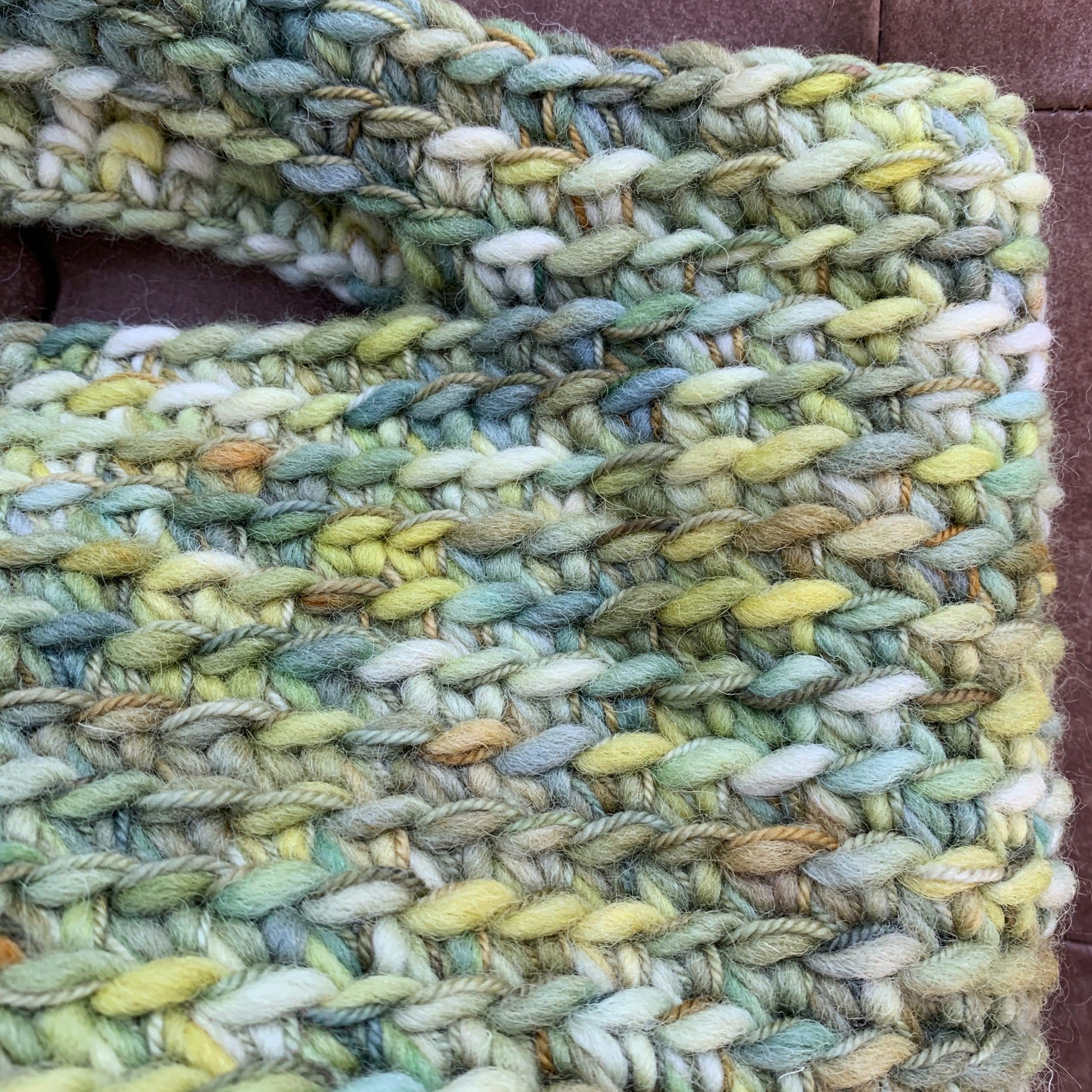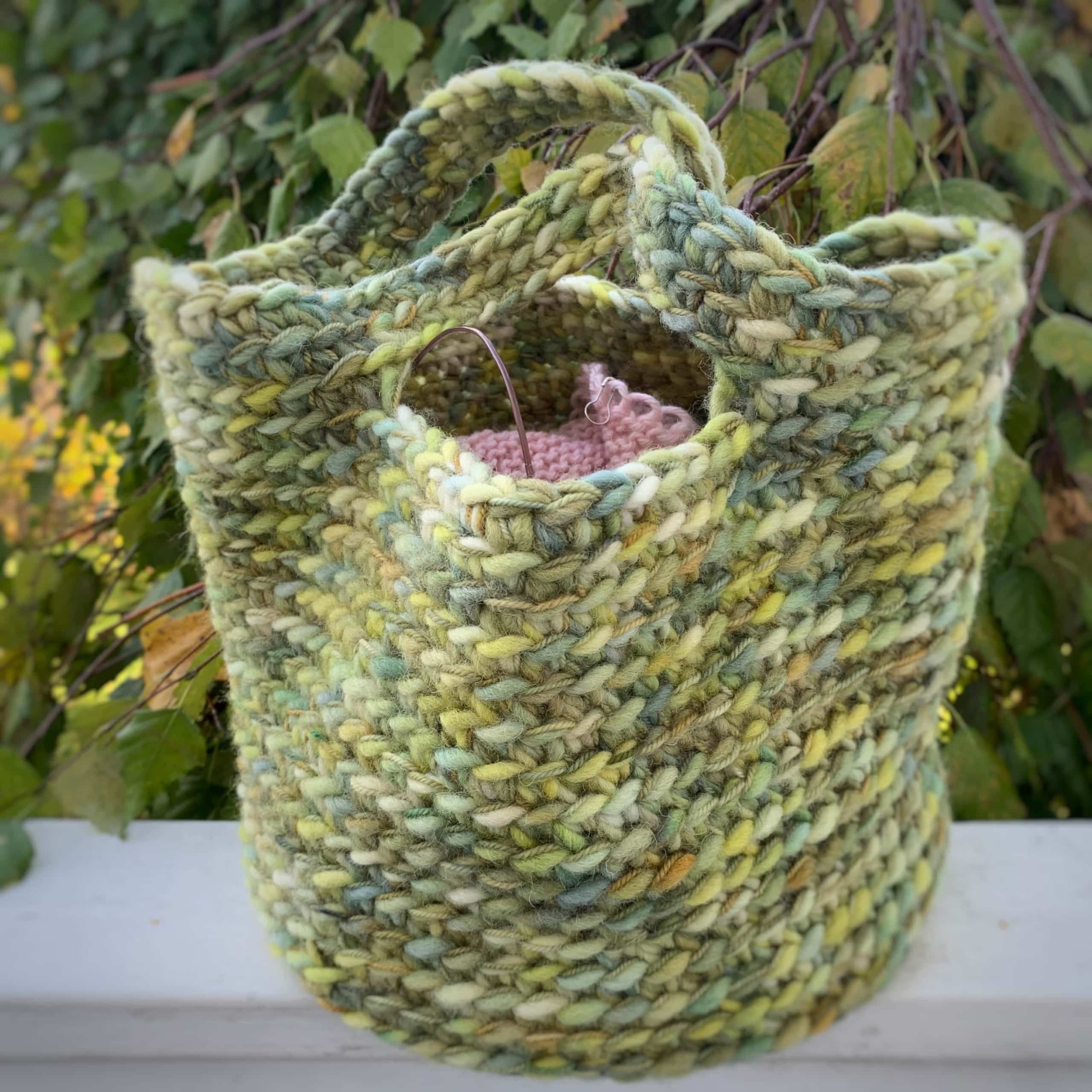Den grønne taske er hæklet i 2 tråde – 1 tråd Super Chunky Cheviot og 1 tråd Merino 300.